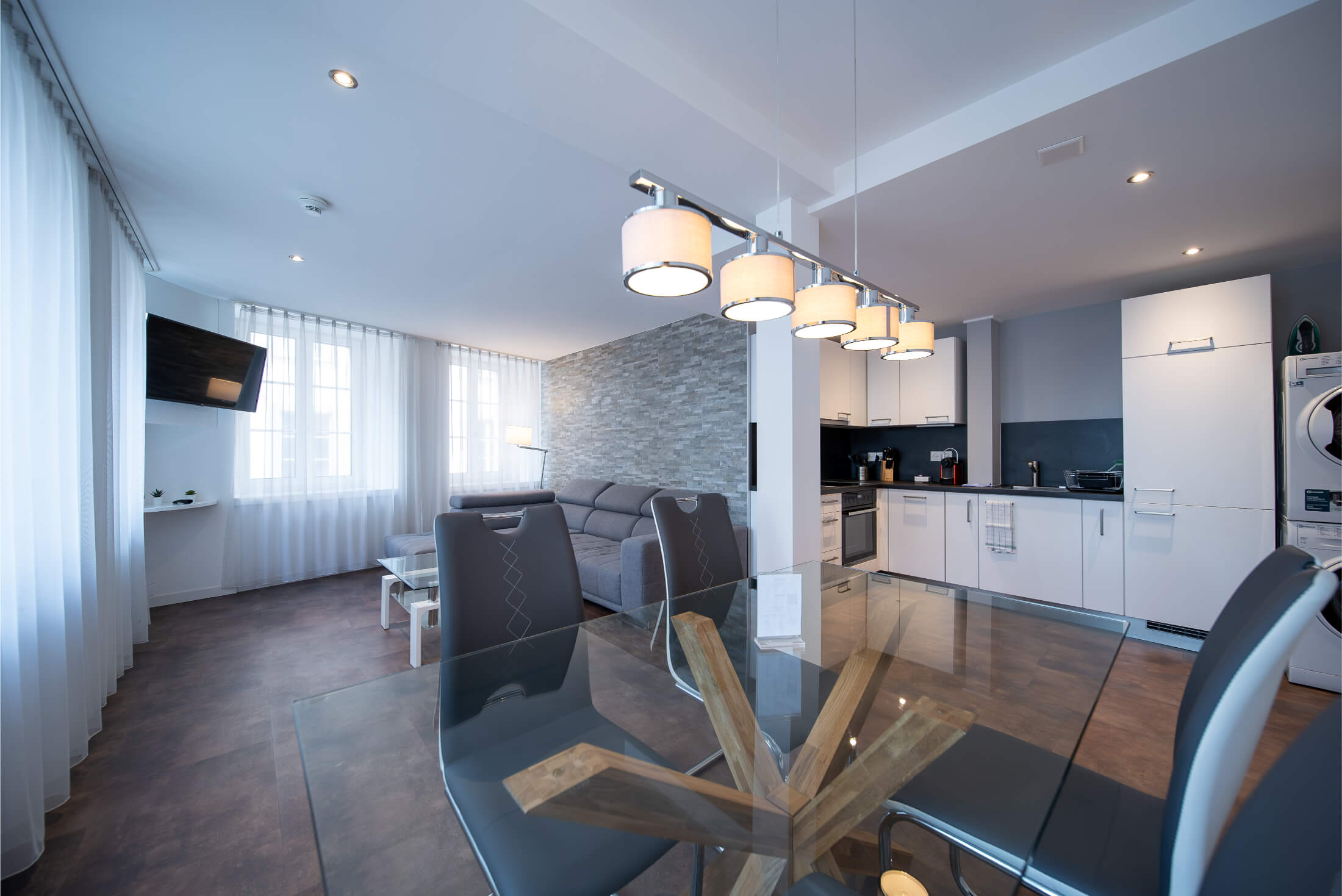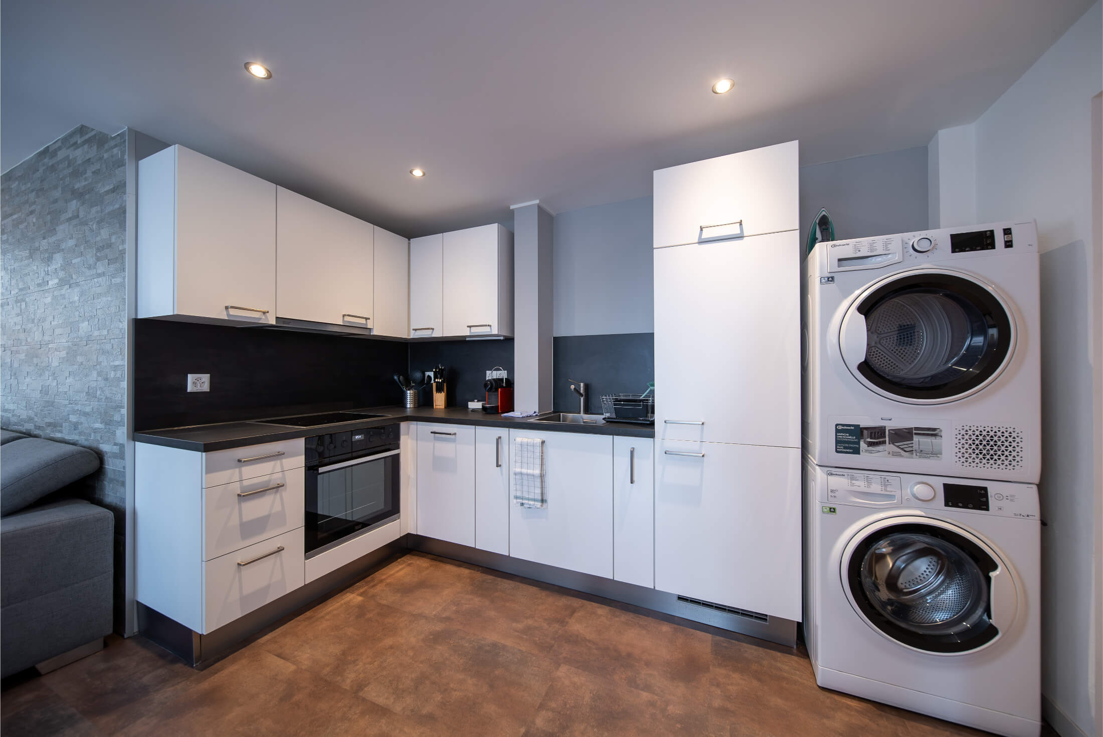 Jede Wohnung ist mit einer Nespresso-Kaffeemaschine sowie einer eigenen Waschmaschine und einem Trocknungsgerät ausgestattet. Ein Anfangsbestand an Kaffeekapseln und Waschmittel ist bereits inklusive – weitere Kapseln und Waschtabs können bequem über das Hotel bezogen werden.